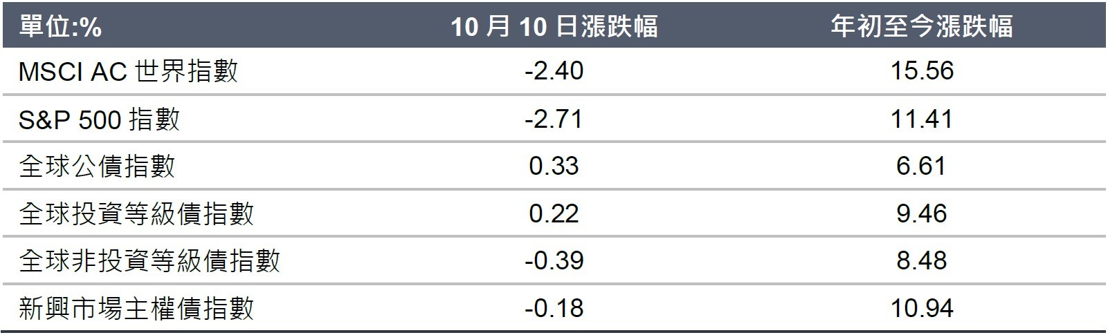 - 在原定11月10日談判到期日之前,一系列管制行動使貿易戰迅速升級引發了市場擔憂。投資人對美中貿易關係回穩的期待可能落空,會轉變為衝突加劇的局面,全球股市10日表現重挫,全球公債與投資級債走揚。