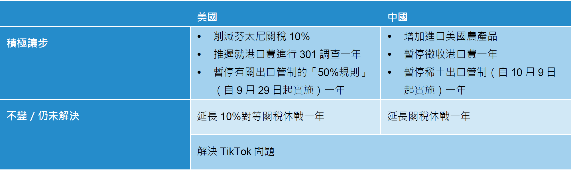 - 在貿易與關稅方面延長休戰:美國將對中國芬太尼(Fentanyl)徵收的關稅從20%削減到10%,並將目前的10%對等關稅延長一年(原定於11月10日到期)。美國對中國的有效關稅稅率(ETR)從約41%降至31%,但仍然幾乎是其他亞洲國家平均水平的兩倍。美國還同意暫停「50%規則」,暫時不會將制裁擴展至被列入黑名單的公司旗下子公司。作為回報,中國將推遲稀土出口管制(以及10月9日宣佈的相關措施)一年,並恢復購買大豆,讓美國農民適度紓困。