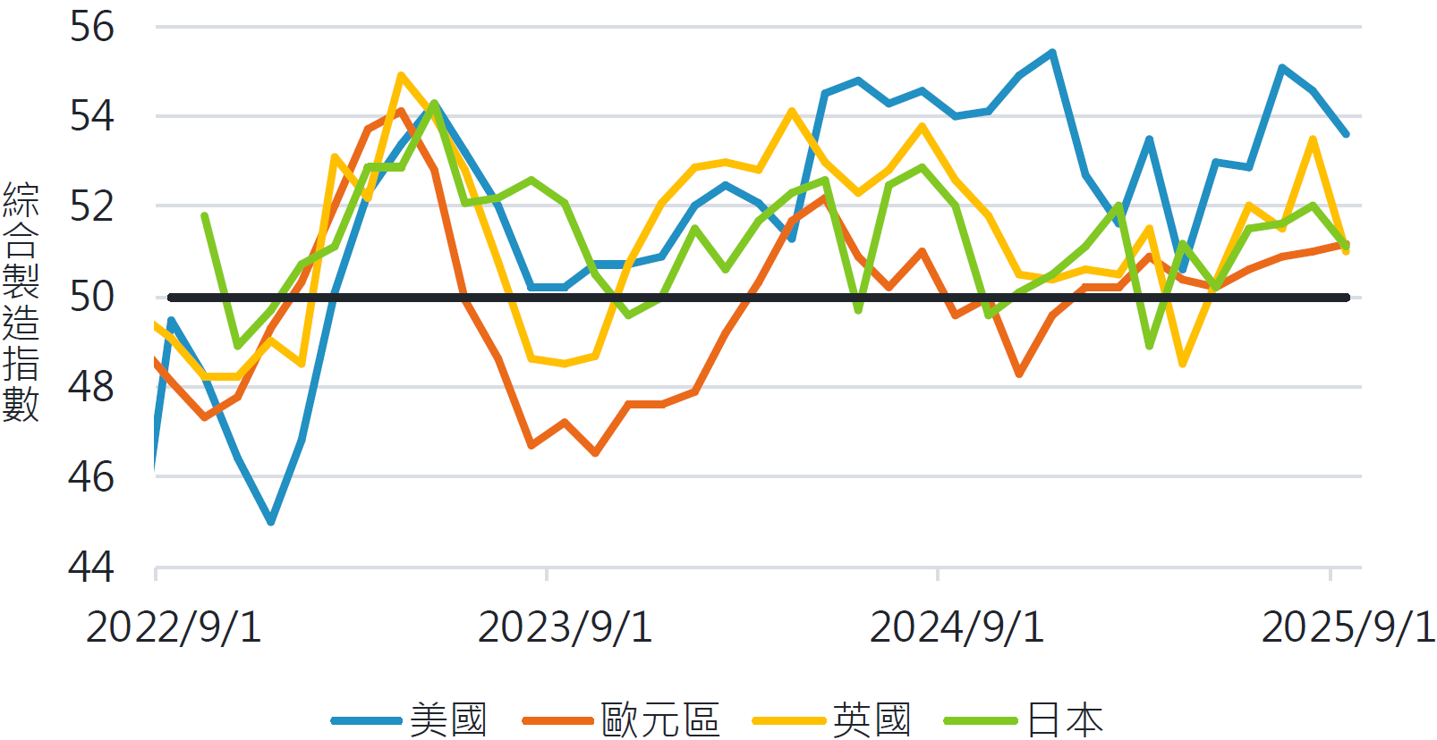 美國9月份綜合PMI指數略降至53.6,仍位於景氣榮枯線上方,顯示整體業者對經濟成長仍相對樂觀。隨著關稅不確定下滑,來自歐亞地區的提前備貨潮開始消退,略為拖累製造業前景。同時,由於此波備貨潮,美國製造業庫存也來到15年高點,後續將關注去庫存對製造業前景的影響。