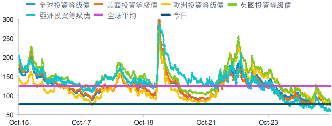 - 投資等級債:九月,全球投資等級債市場的利差收窄速度加快,伴隨著新債發行量上升以及相對平靜的市場消息面。我們仍維持整體偏向防禦性資產配置的立場,並傾向在市場表現出色時降低風險。信用利差走勢大致持平,維持在歷史低位的緊縮區間。