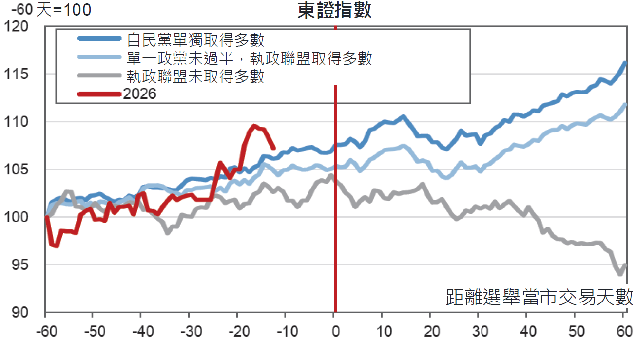 從歷史經驗來看,在自民黨單獨取得眾議院過半時,日股通常表現更為亮眼;若執政聯盟未能掌握多數,市場往往因政局不確定性而波動加劇,並在選後走弱。儘管本次選舉結果仍待觀察,但相較於過去受派系鬥爭與政治獻金醜聞拖累,市場普遍認為自民黨此次支持度更具能見度,而後續財政刺激措施亦有望推升日股中長期動能。