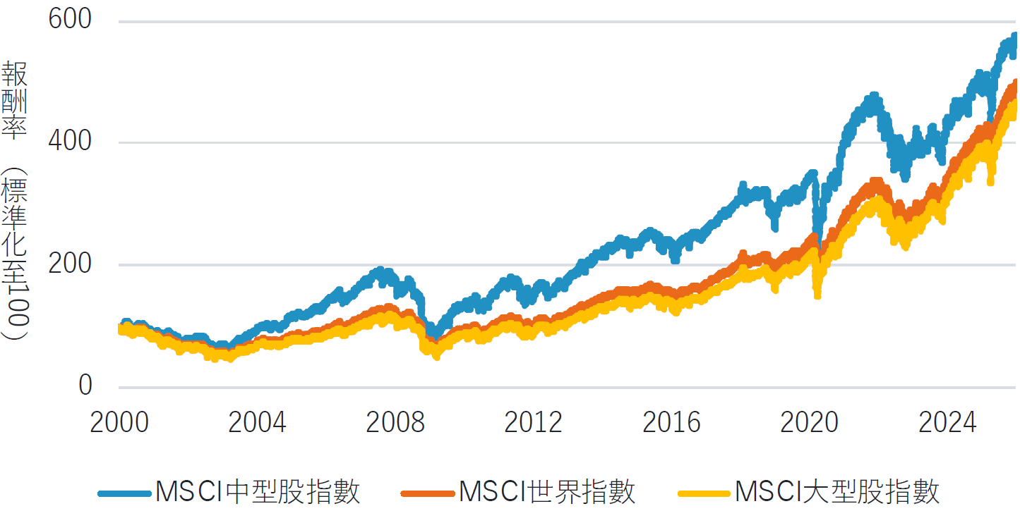 - 全球中小型股除提供具吸引力的投資報酬外,也能有效降低投資組合對大型股的集中風險。儘管中小型企業的股價波動度相對較高,但以風險調整後報酬觀察,其表現仍優於大型企業。過去 25 年來,已開發市場中型股相較大型股,累積創造約 107% 的超額報酬。此外,配置中小型股亦有助於降低投資組合對大型企業的過度集中,進一步提升整體投資組合的韌性。