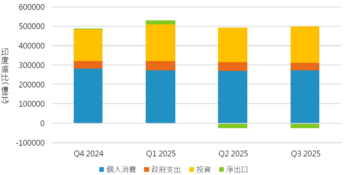 印度股市近期承壓,主因國內成長降溫與企業獲利動能放緩;過去兩、三年消費與投資的高峰進入調整期,高端消費降溫、民間投資轉趨保守,加上市場一度擔憂美國貿易政策帶來外需不確定性。觀察 GDP 結構,印度經濟仍以內需為主,市場關注焦點已由高速成長轉向經濟再平衡是否能順利推進。