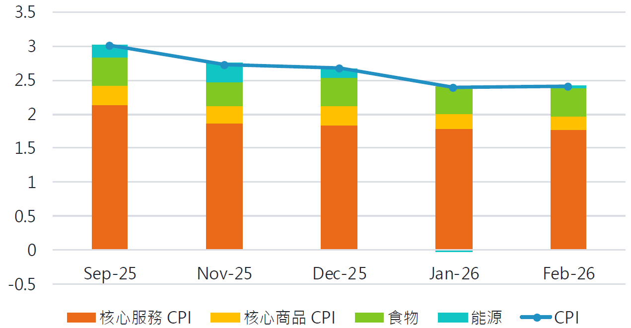 最新公布的 2 月美國 CPI 年增率維持在 2.4%,符合市場預期,亦為 2021 年以來同月最疲弱的通膨表現。核心 CPI 與 1 月持平,核心商品通膨雖受全球鋁供應吃緊,以及記憶體晶片短缺等供給衝擊推升,但在二手車、服飾等高權重項目走弱,加上企業年初調價效應逐漸消退之下,上行壓力被有效抵銷,商品通膨動能因此進一步降溫。