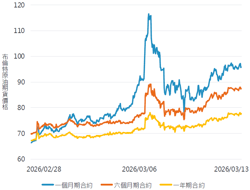 海峽受阻迫使多國減產,區域煉油廠與 LNG 設施停擺,全球供給進一步收緊。油價曲線短端快速收斂、中長天期同步上升,六個月與一年期布蘭特期貨價格走高,反映市場預期衝突可能延續更長的時間。