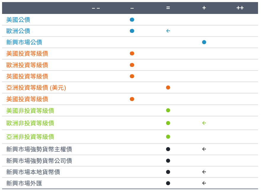 - 新興市場債:美國公債殖利率下滑為強勢貨幣計價的新興市場債帶來支撐,然而利差擴大限制了整體漲幅。本月下調新興市場強勢貨幣主權債、新興市場本地貨幣債至中立。