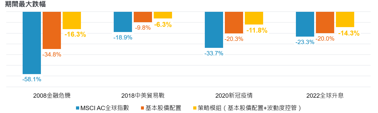 資料來源:富達國際,2024/12/31。基本股債配置比例為股票55%、債券45%,股票指數採MSCI AC全球指數,債券指數採Bloomberg Global-Aggregate Total Return Index;波動度控管策略是指團隊在市場壓力情境下,適當調整股債比率,降低投組波動度。統計期間:2008金融危機(2007/10-2009/3)、2018中美貿易戰 (2018/10-2018/12)、2020新冠疫情(2020/2-2020/3)、2022全球升息(2021/7-2022/10)